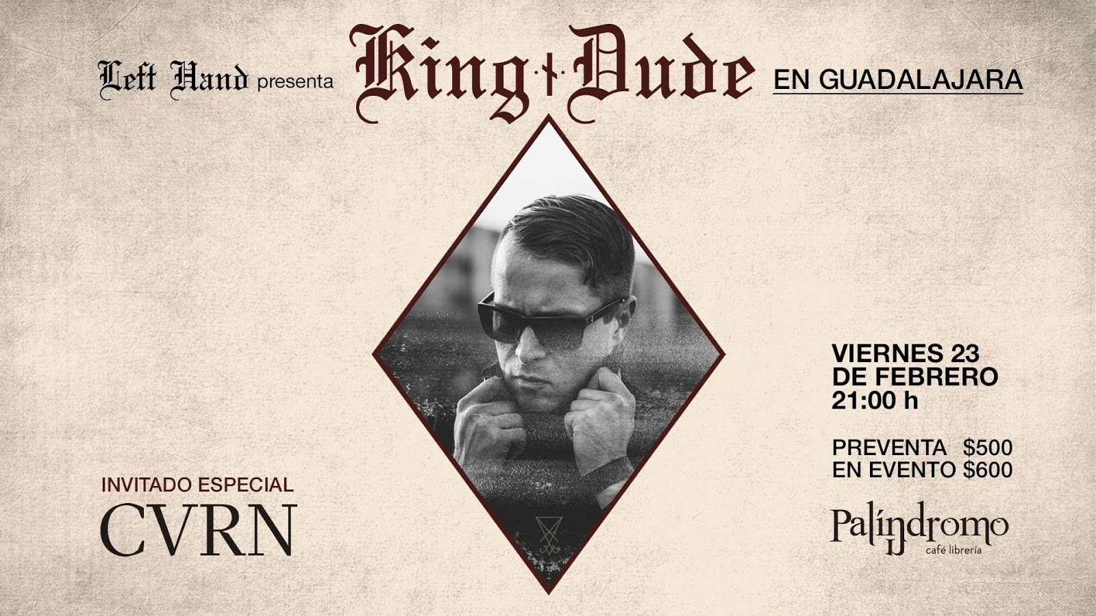 El próximo 23 de febrero TJ Cowgill nos visita con esta nueva propuesta, que sin duda vale la pena escuchar. King Dude estará en Palíndromo Café que se ubica en calle Juan Luis Alarcón 233, y estará alternando junto a CVRN (Caverna), éste un proyecto de Alex Caverliere (Disidente) y que en sus palabras, “Es como Clint Eastwood interpretando a Mad Max” otro nuevo trabajo en el que vale la pena poner atención.