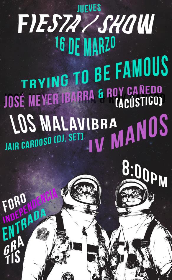 El próximo jueves 16 de marzo a las 20:00 hrs, el Foro Independencia se llenará de sonidos locales en una Fiesta-Show, donde participarán los proyectos Trying to be Famous, IV Manos, José Meyer Ibarra & Roy Cañedo (Thermo), Los Malavibra y Jair Cardoso, en un evento que será gratuito y para todas las edades.